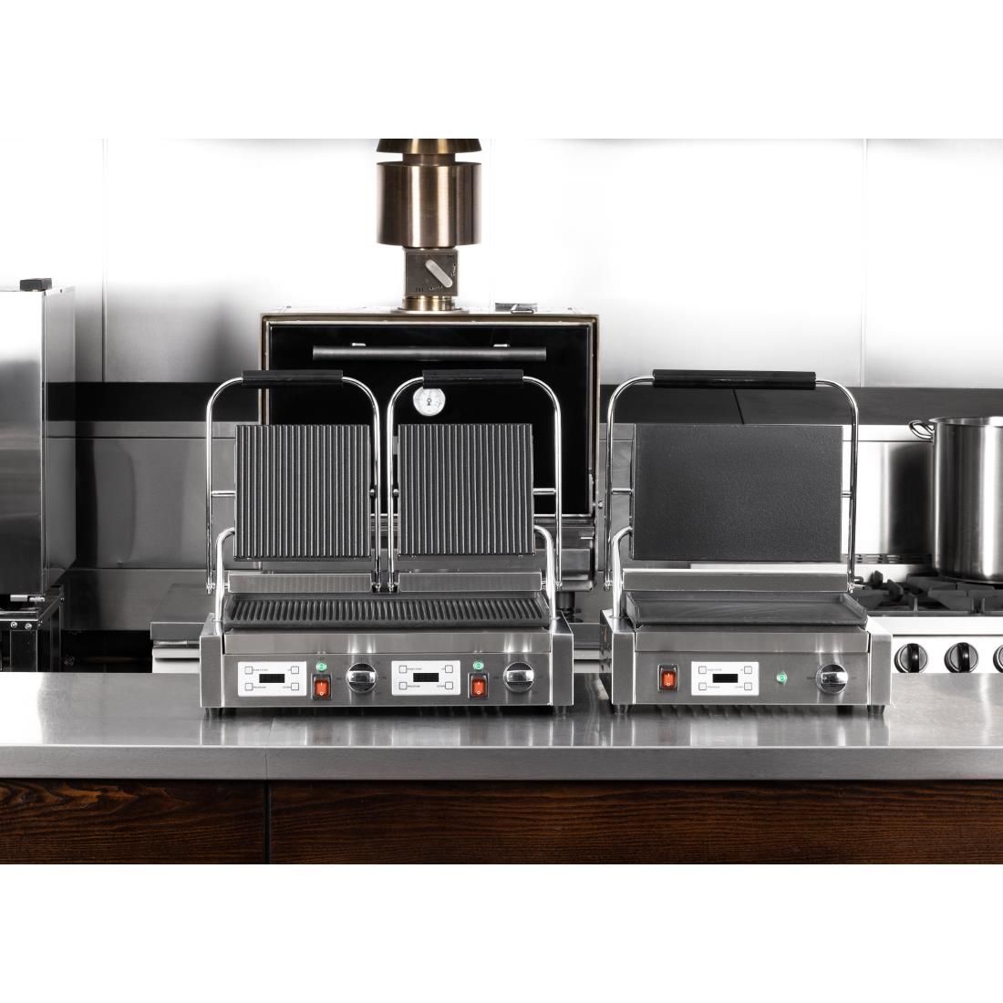 If you're looking for a high capacity grill which is both powerful and reliable, look no further than the Buffalo extra large contact grill. Designed for the professional, the grill heats from both top and bottom enamelled cast iron cooking plates, so whether you're cooking eggs, steaks, fish or bacon the grill cooks it fast and evenly. Simple dial controls and the built-in programmable digital timer provide plenty of cooking accuracy, so you can cook to perfection, even if your attention is focused elsewhere. Cleaning is simple too, as the grill includes a handy removable fat collection tray which is easy to empty when required.