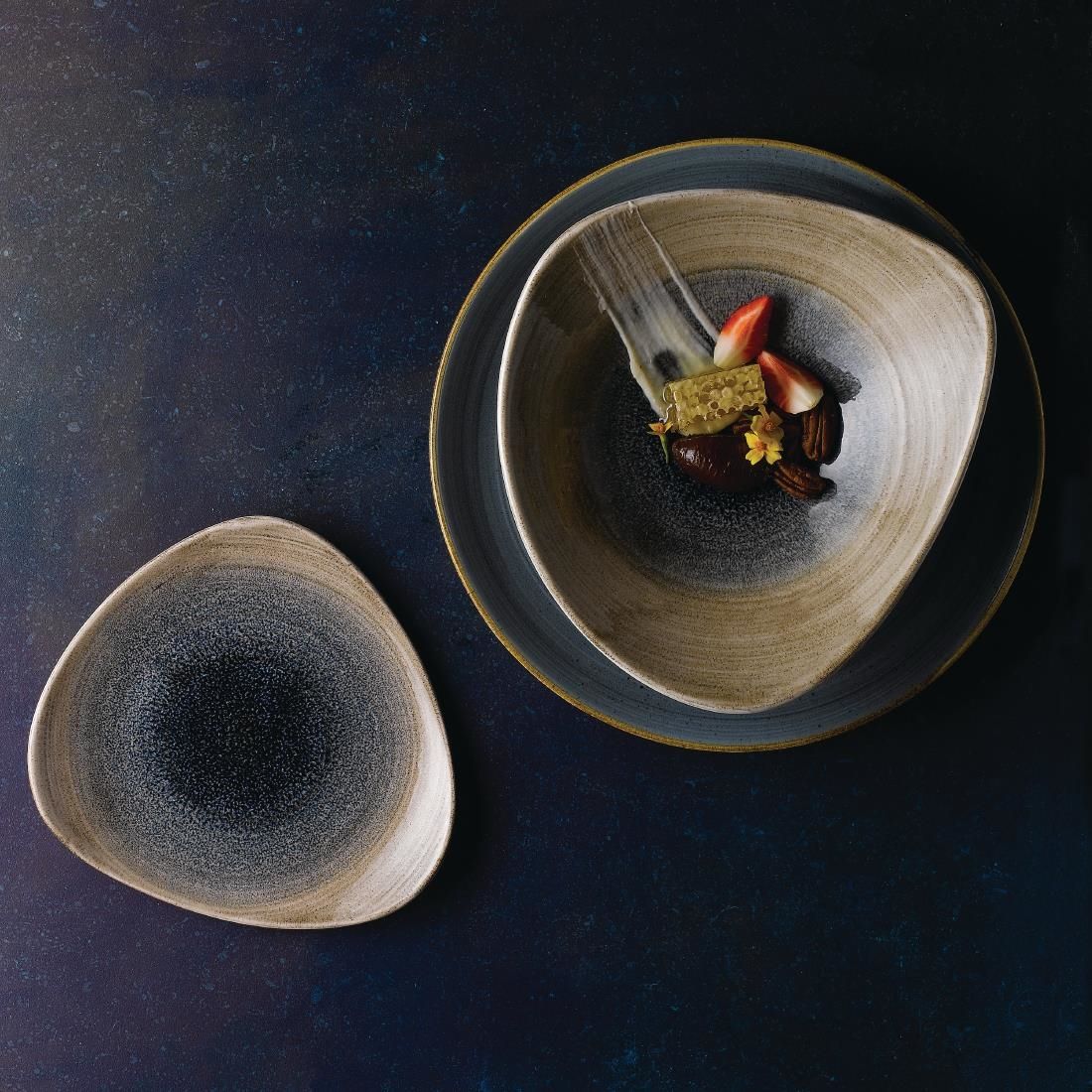 With earthy, organic tones and a brushed finish that differs slightly from piece to piece, the Aqeuous Trangular Plate oozes rustic charm. The ideal backdrop for dishes with a natural feel, the glaze that pools in the centre draws out the colours in the fresh ingredients you use to ensure your dishes come alive with energy. The triangular shape gives you a wide canvas with which to get creative when plating, and helps to break up table tops laid with all-circular crockery to add an extra layer of visual interest. As strong in build as it is in looks, the Aqueous is finished with a superior glaze to keep it looking its best for longer, no matter how busy your venue.