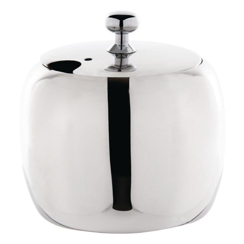 Contemporary range in heavy-duty, highly polished stainless steel. Non-drip spouts and stay cool handles with useful thumb support for pouring. Universal pot design is suitable for tea, coffee or hot water for maximum versatility. Sugar bowl features lid to protect contents.