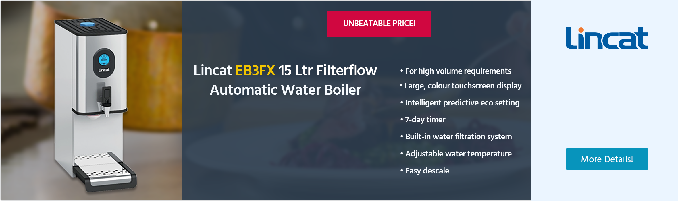 Catering Appliance Superstore stocks water boilers with a huge range of capacities from 3 litres to 135 litres, and with single tap and twin tap models, some with hot and cold filtered water available from the same unit, or features like seven day timers and push button operation. We can supply the best hot water boiler for your business, at the best price.