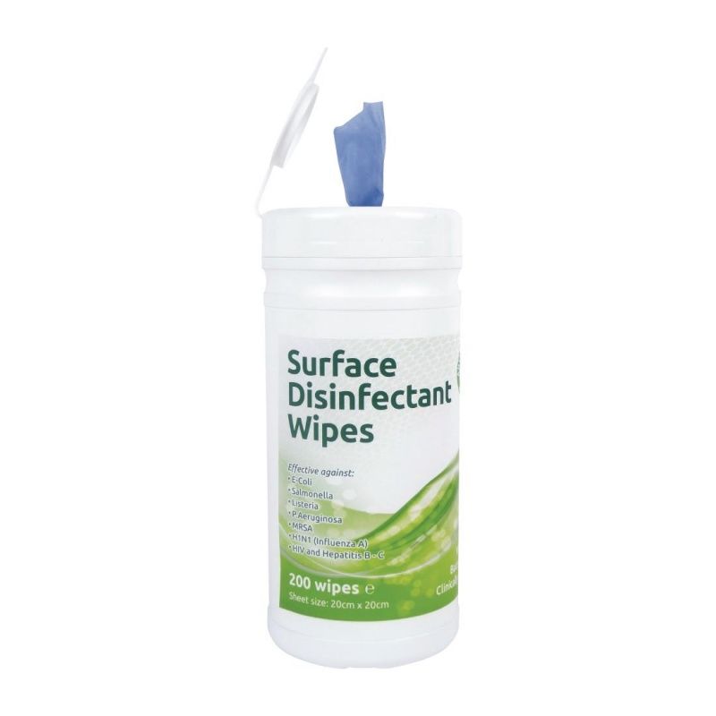 Contents: 200 Wipes. BS EN 1276 Approved. BS EN 14476 Approved.A tub of 200 x disinfectant surface wipes made to reduce bacteria to safe levels and minimise the risk of cross contamination in your venue.
