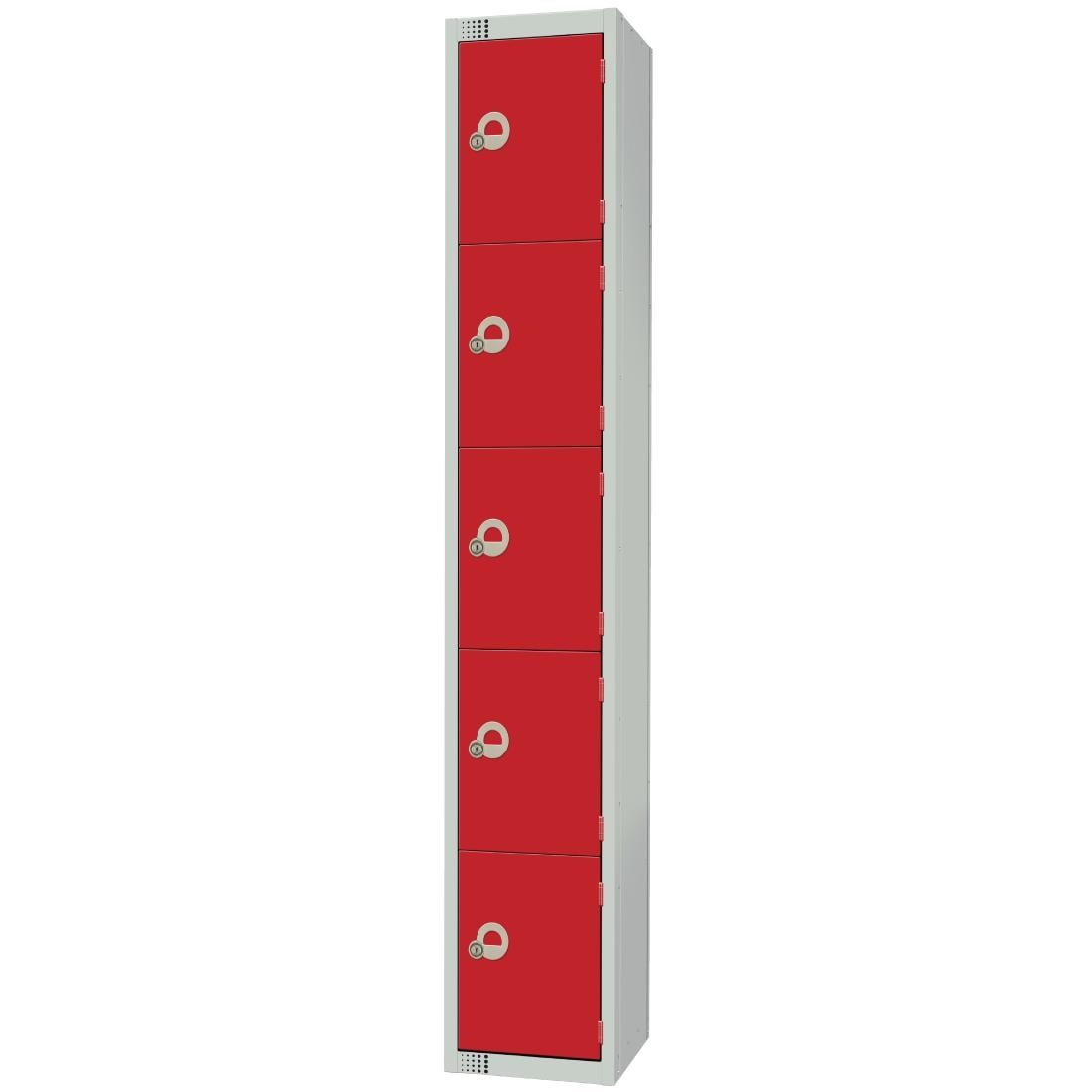 Provide safe and secure personal storage with these five door Elite lockers. Toughened steel frames are coated with an anti-bacterial agent effective against MRSA and E-coli, making them perfect for use in changing rooms and workplaces. The doors are reinforced and compartments are separated by a strong welded base. A coin return mechanism is fitted to the doors and accepts the new British £1 coin. Pre-drilled nesting holes facilitate easy fixing to the wall for added stability.