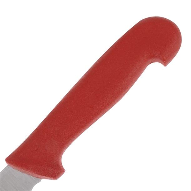 This serrated slicer knife by Hygiplas has a blade which is made from the finest stainless steel and also features a colour coded dishwasher proof handle. This knife has a red handle which means it's suitable for cutting raw meats.