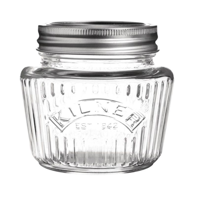 Airtight seal. Capacity: 250mlNew Kilner ribbed vintage preserve jarm features a silver-coloured easy to use metal screw top lid, made up of two pieces, a replaceable vaccum seal and a metal screw band to secure the lid.