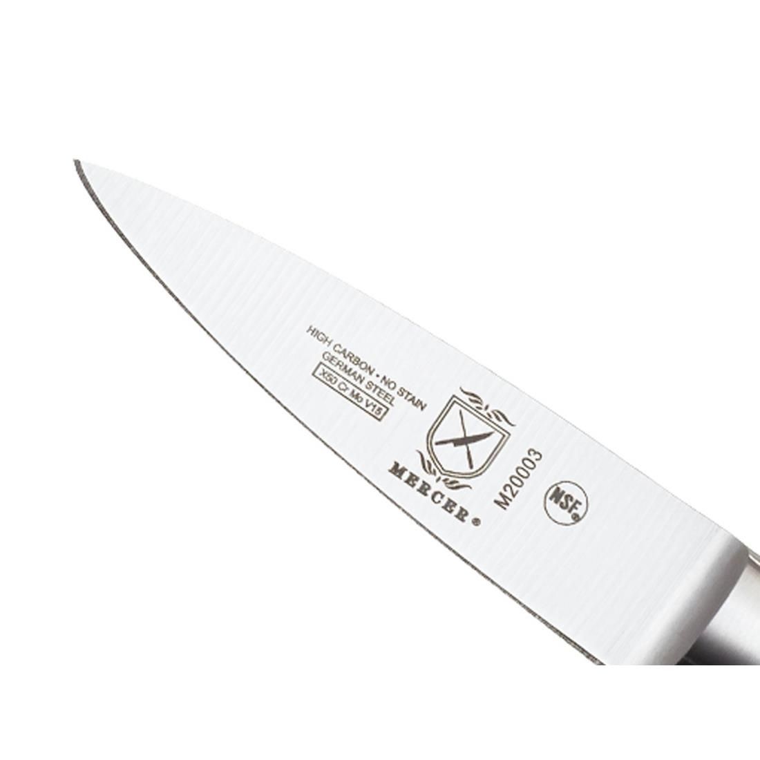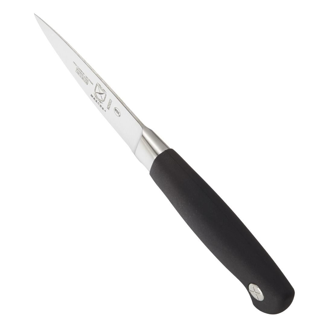 Part of the Mercer Culinary's Genesis collection, this paring knife features an ergonomically designed handle comprised of Santoprene, a high-performance material that feels soft and is comfortable to hold. The Santoprene handle will not break down when exposed to kitchen oils and is able to withstand hot and cold temperatures. Plus, it offers a nonslip grip for safety with extended use.
