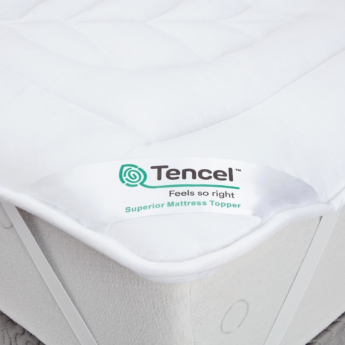 A more luxurious version of our Tencel topper. This 1000g/m² quilted topper comprises of a Tencel filling to ensure a pleasant night's sleep. Filling: 30% Tencel, 70% polyester Hollowfibre. Fitting: elasticated bands. Cover: 100% polyester microfibre. Weight: 1000g/m².