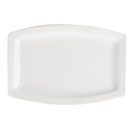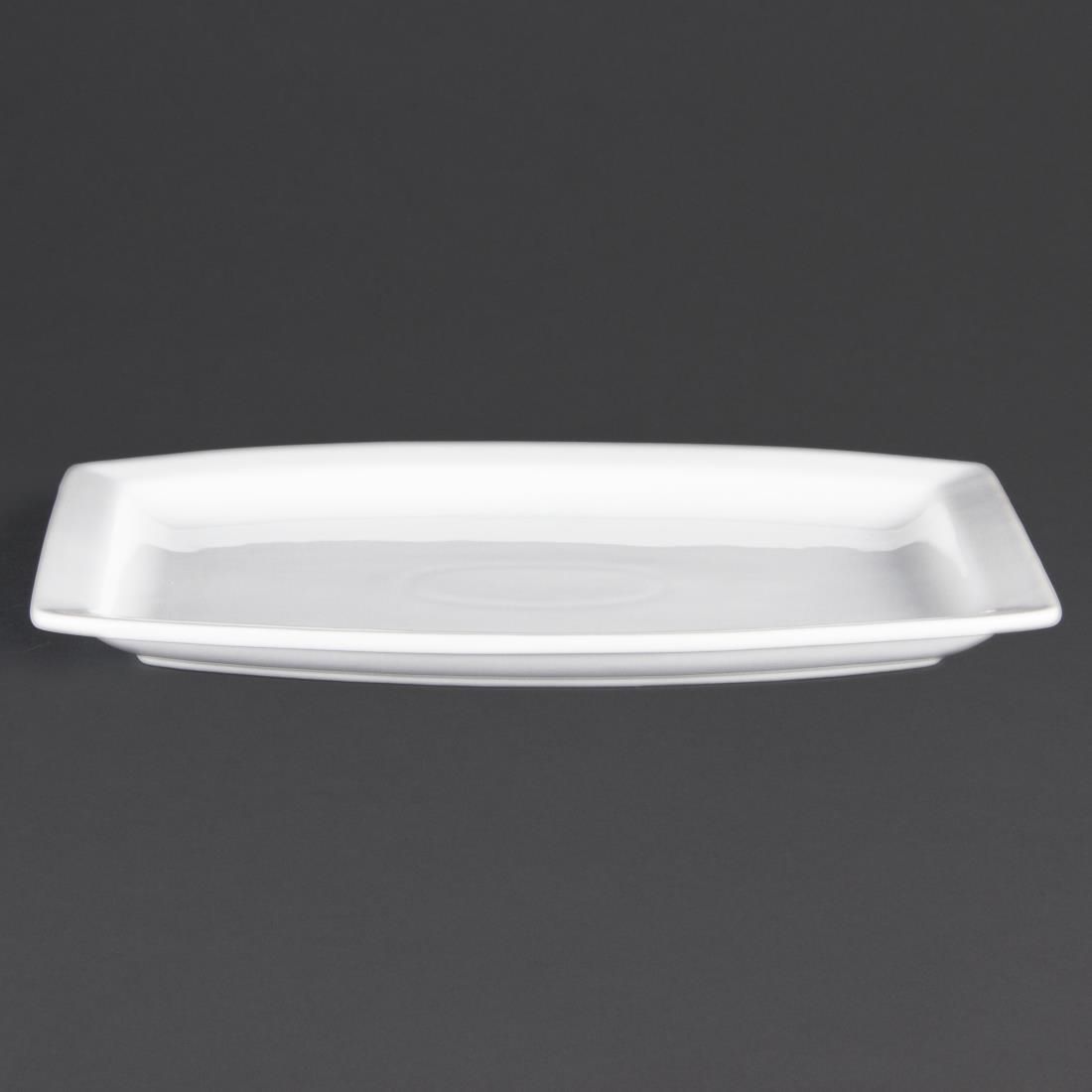 Great value hardwearing pure white porcelain rectangular 12 ¾" plates by Olympia, with the added advantage of stackability and strengthened rolled edges for chip resistance.