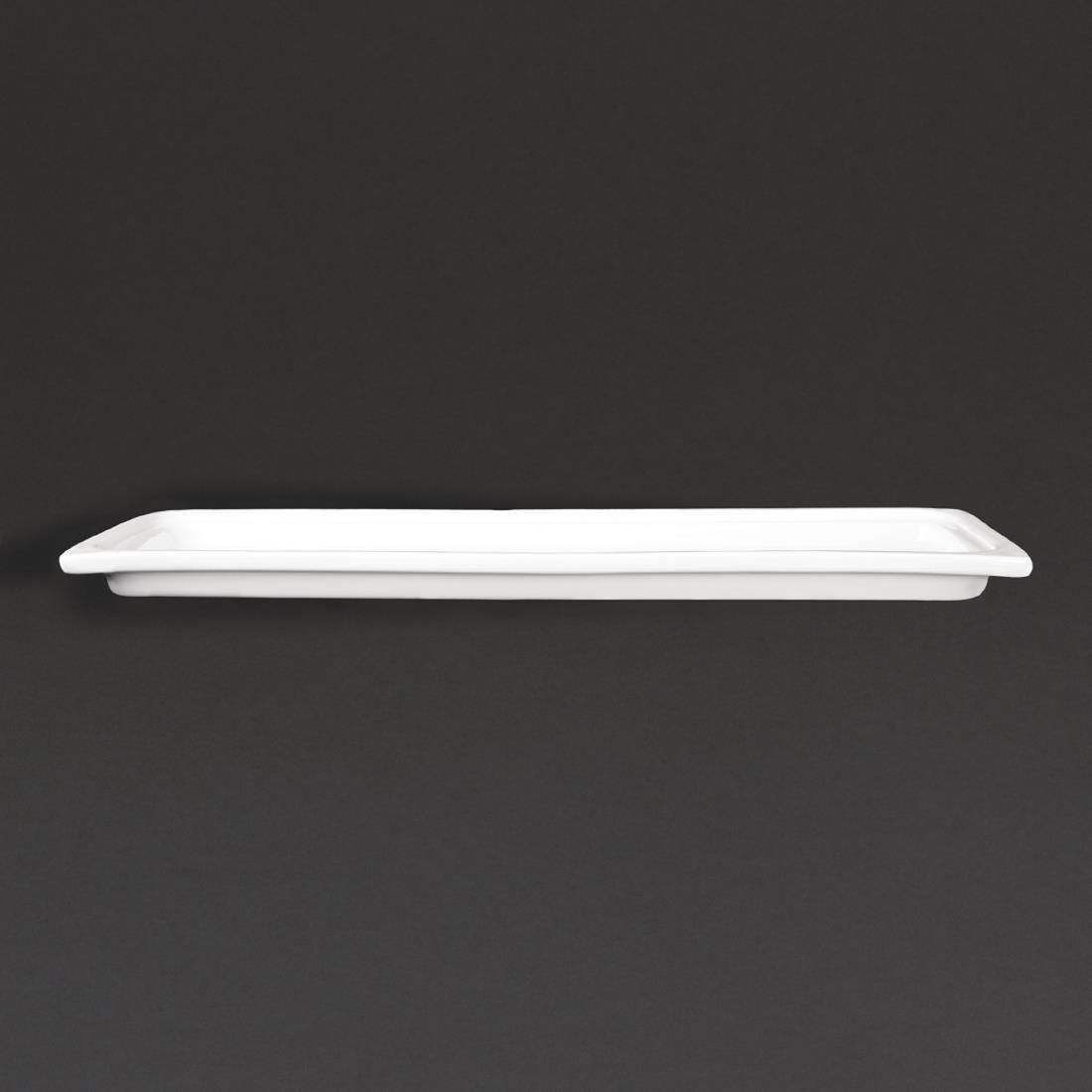 Gastronorm sized porcelain dishes suitable for hot or cold food preparation, storage and presentation in buffet displays or as an alternative to traditional stainless steel pans.