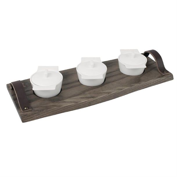 Serve tapas, small appetisers and vibrant dips in exquisite style, using this 370(W) x 150(D)mm Olympia ash wood serving platter with leather handles. Built from premium ash wood, the tray offers a stunning rustic look, perfectly accentuating the artisan appearance of handcrafted dishes. Two real leather straps also ooze modernity, adding a unique and contemporary touch to your tabletops. With three 60(Ø)mm recesses, this board is able to accommodate Olympia Kiln dipping pots, Olympia mini pans and many other small pieces of crockery, giving you ample choice over how you present your food. The ash wood construction also makes this board remarkably strong and sturdy, preventing it from damaging if knocked or dropped.
