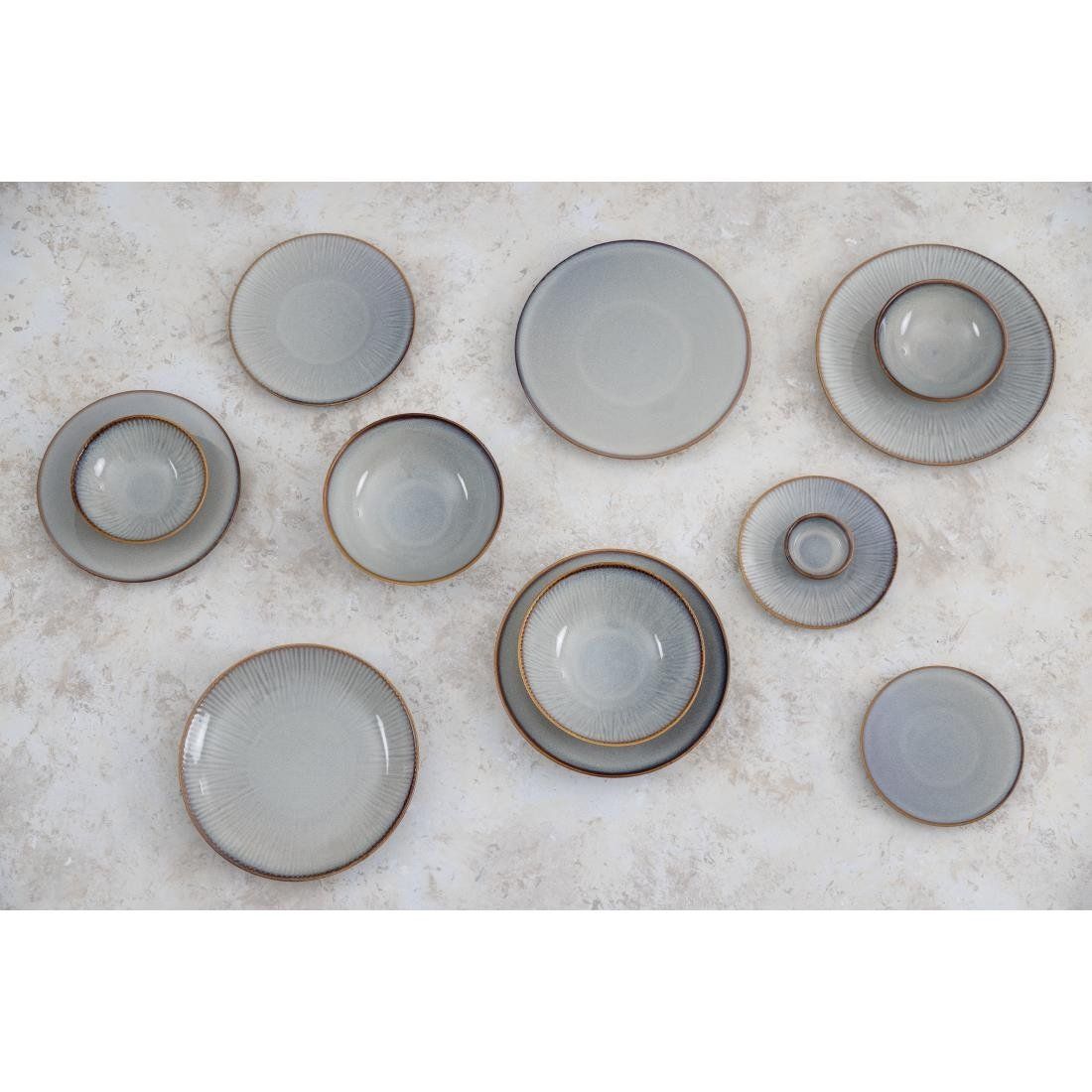 Olympia's Drift range is available in either a plain coupe shape or with a faint fantail embossment along the rim. Designed to complement each other, the plain and embossed options allow for versatile combinations. These Drift embossed coupe bowls feature a sleek pale grey reactive glaze and a contrasting rim that not only adds a touch of style but also shapes the bowl perfectly. Practical features include stack-ability for easy storage and an unglazed foot that helps prevent slipping. Plus, they are dishwasher safe for quick and effortless cleaning.