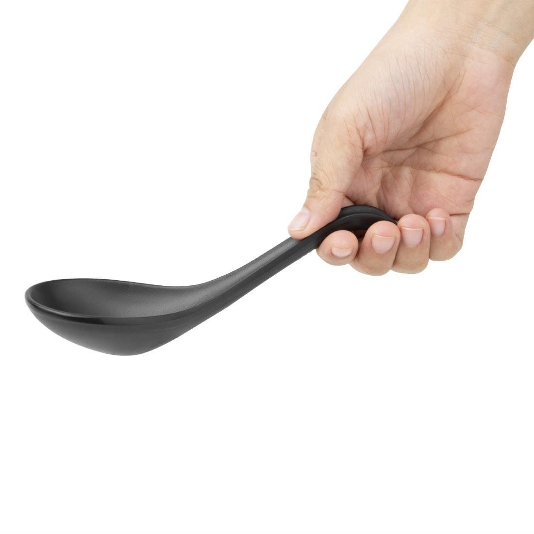 Serve delicious soups and other broth-based dishes with these long spoons from the Kristallon Fusion collection by Olympia. Produced in a contemporary black colourway, the spoons are made from high-quality melamine, renowned for its durability and resilience. They work superbly with Olympia Fusion crockery and are dishwasher safe for easy cleaning.