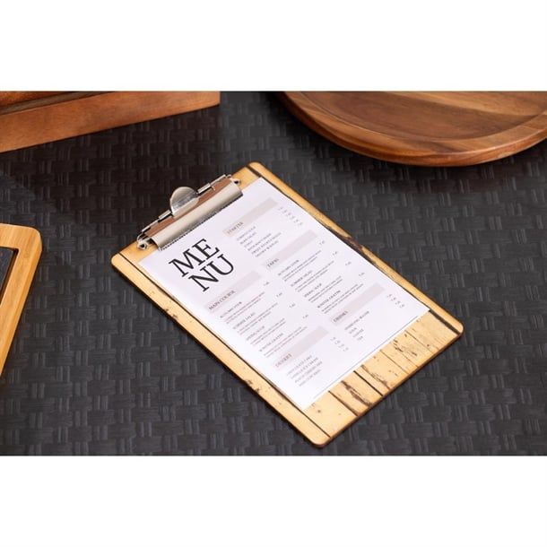 Versatile and practical, this Wooden Menu A5 Presentation Clipboard is perfect for establishments with frequently changing drinks or specials menus, or for those seeking a rustic touch to their menu presentation. The sturdy bulldog clip mechanism securely holds multiple sheets with ease, allowing for quick menu changes - ideal for busy restaurants, cafés and bars. Plus, it's easy to wipe clean, ensuring it stays looking great even with heavy use.