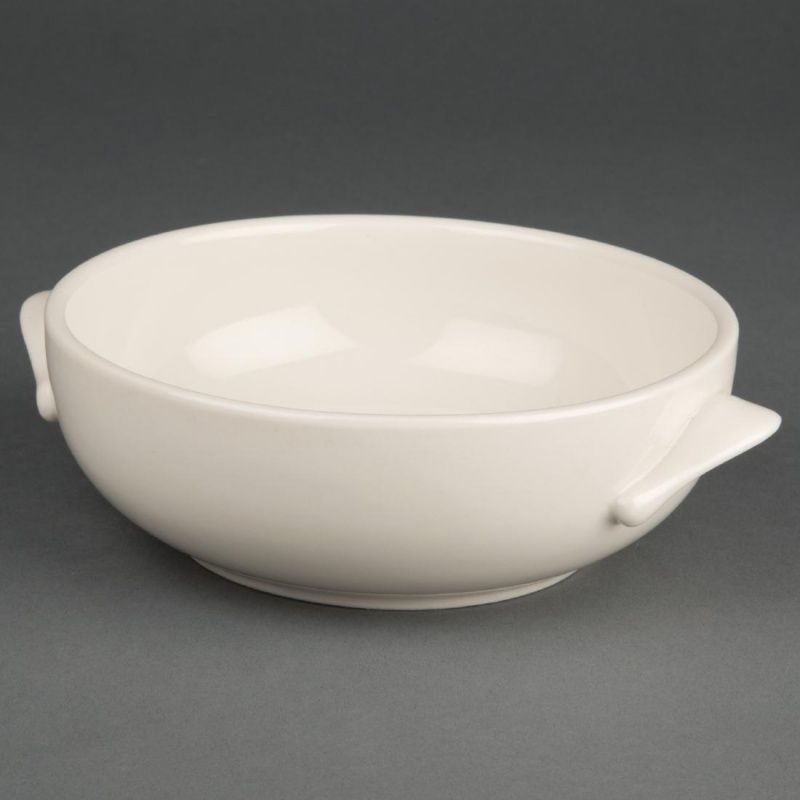 Designed with a simple, clean shape in a soft ivory colour, this soup bowl with handles from Olympia Ivory will impart a contemporary feel to your food service. Ideal for use in cafes, hotels or restaurants, the bowl is made from fully vitrified porcelain with rolled edges, which gives heat and shock resistance, as well as high glaze durability. The bowl is oven, microwave and dishwasher safe, allowing it to withstand the rigours of a busy catering service.
