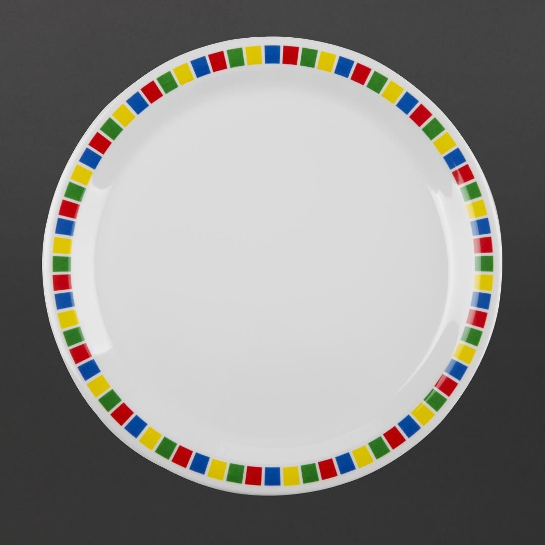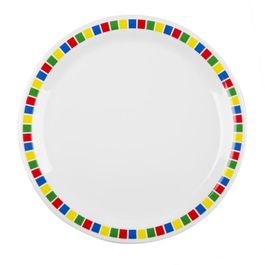 For a hygienic and durable alternative to china, our Olympia Kristallon melamine Fairground range 9" dinner plates are the perfect crockery for use in schools, nursing homes and other establishments. Melamine is a durable, scratch and chip resistant plastic which is lightweight, and this melamine crockery range has a colourful patterned rim.