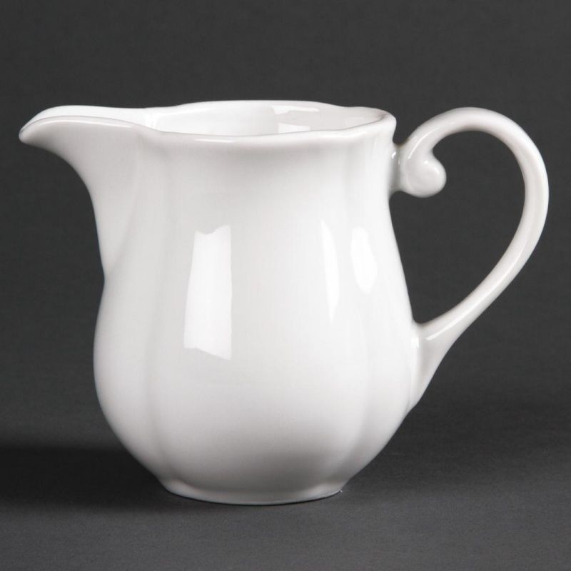 140ml (5oz). White. Box Quantity: 6.This delicate Rosa range by Olympia is subtly and delicately embossed in a traditional style, ideal to use every day in hotels, guest houses and tea rooms. These milk jugs are fully vitrified to ensure the long life of the glaze and have rolled edges to help prevent any chips.
