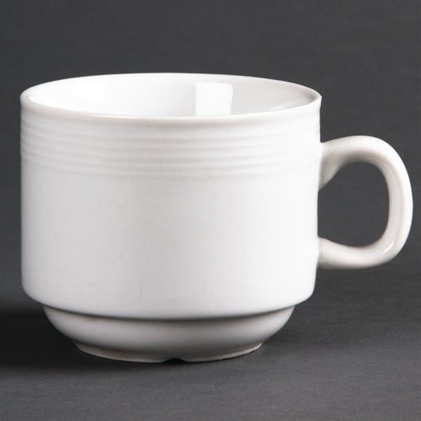 This stylish stacking 200ml tea cup from the Linear range by Olympia is made from plain white porcelain and features a delicately embossed lined pattern. The cup is fully vitrified, giving excellent heat and shock resistance and glaze durability, making it robust and able to withstand the rigours of a professional catering establishment. The tea cup also helps maximise storage space as it is stackable. (Matching saucer sold separately.)