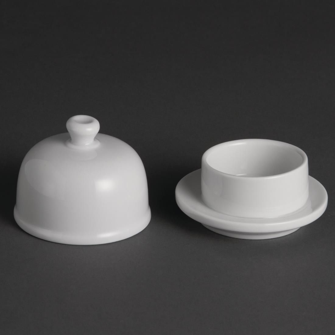 An appealing, pure white butter pad (with cover) from Olympia, designed to provide a great value and hardwearing porcelain crockery solution for busy hotels, canteens, casual dining restaurants and cafés. Strengthened rolled edges ensure the pad and lid are chip resistant and the fully vitrified body gives great glaze durability, making it ideal to withstand the rigours of the professional catering environment. The pad is oven, microwave, dishwasher and freezer proof.