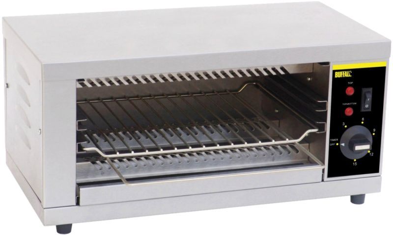 Versatile grill with rapid heat up, heat zone selector switch for top and / or bottom cooking and 0-15 min timer. Suitable for cooking pizzas, grilling, toasting or reheating food. Supplied with grids and handle.