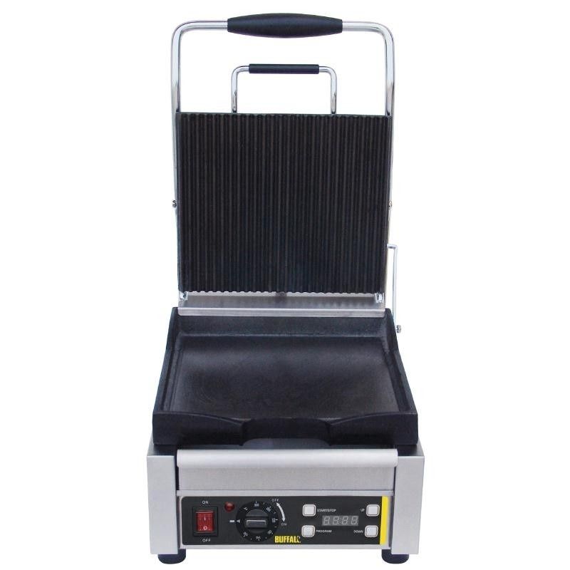 The Buffalo L511 is great for busy hotels and restaurants, this heavy duty single contact grill is fast to heat up and has variable temperature control for maximum functionality so is ideal for cooking burgers, steaks and paninis. Robustly designed, it has cast iron plates and a satin stainless steel finish (scratch resistant) to ensure long-term use. The addition of a programmable timer and audible alarm then makes monitoring cooking in a busy kitchen much easier.