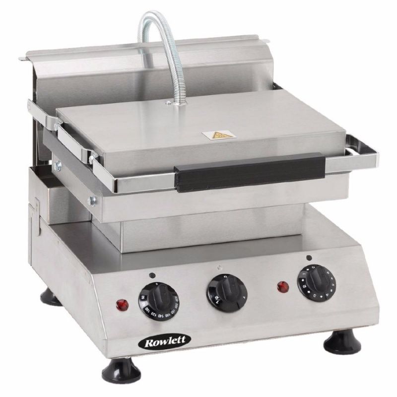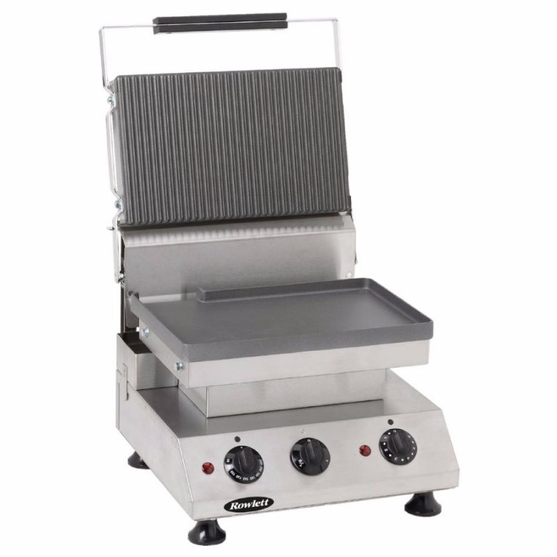 With its unique floating point ribbed upper plate and innovative modern design, the Rowlett RE100FR-PING Express Contact Grill is ideal for cooking panini, meats, vegetables and more. Perfect for front of house use, the grill's floating point plate neatly shapes around the food you're cooking, meaning food is cooked faster and distinctive branding lines are added. Unusually, the grease collection tray is located to the rear of the unit, meaning unsightly fat and debris is kept out of your customer's eye line. Dual elements in each cooking plate ensure even cooking, a longer service life and rapid temperature recovery during busier hours. To save energy, the grill also includes a handy economy mode which reduces running costs by up to 30%, whilst still being ready to cook again immediately.