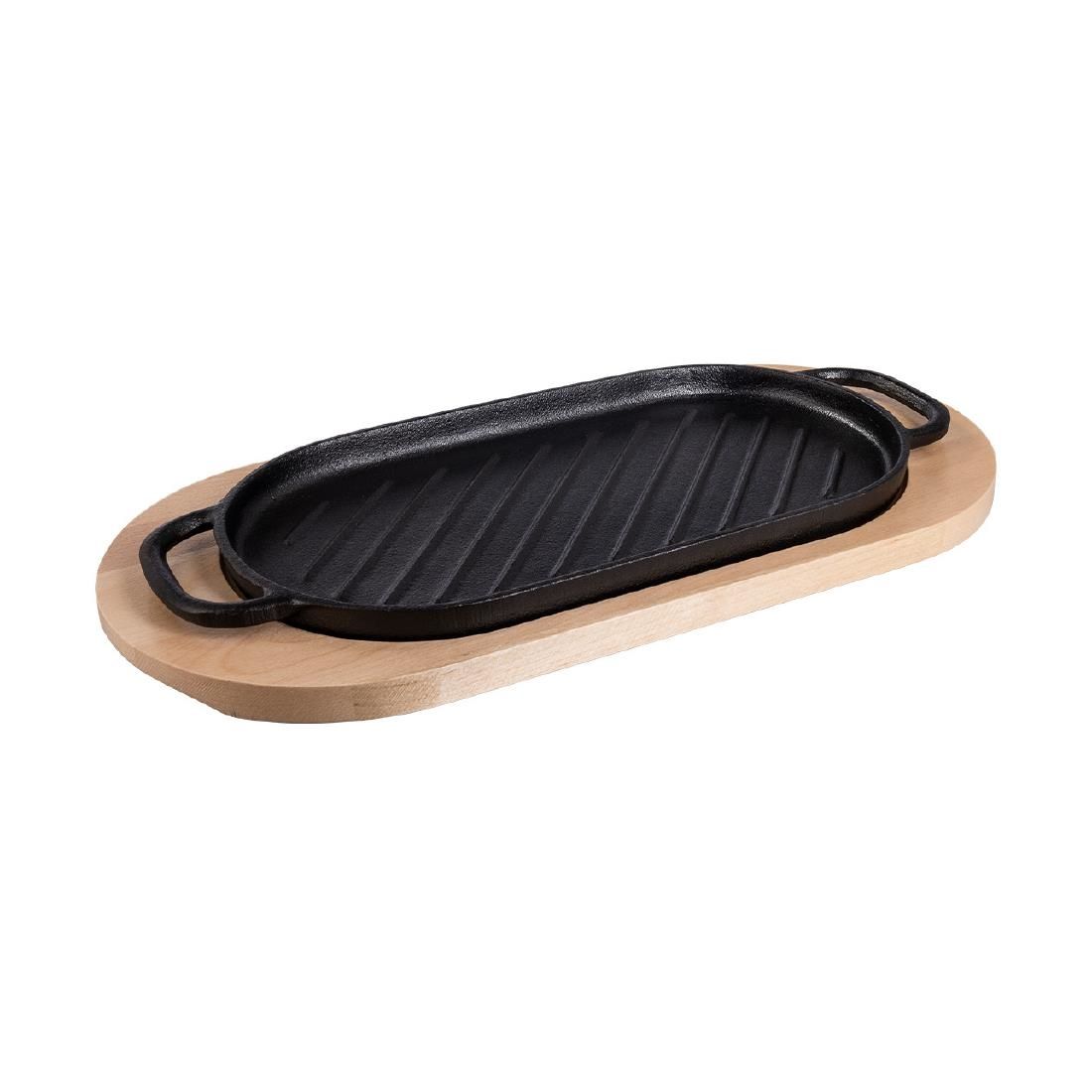 - Ridges give score marks to the food, adding to the authentic grilled look and its generous size makes it perfect for larger portions or for including multiply accompaniments to the platter. It features twin handles and comes complete with a wooden charger plate which protects the table surface from the heat of the platter