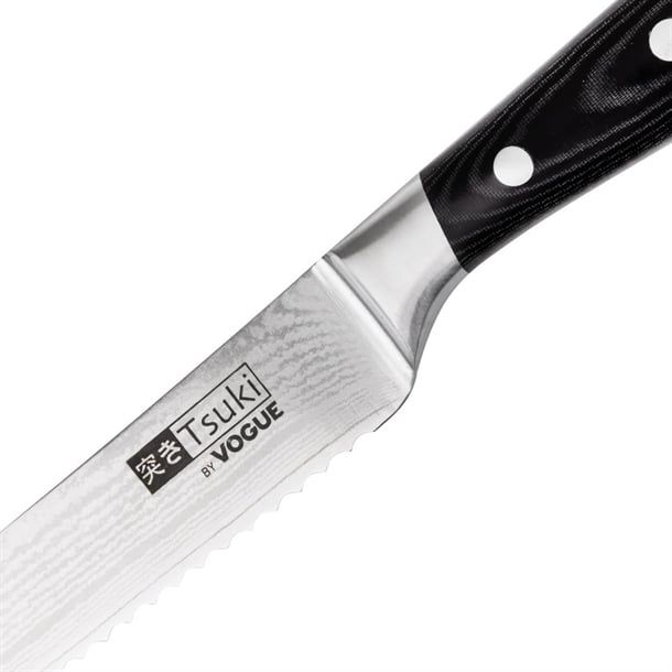 Slice through bread with ease, with the Tsuki Series 7 bread knife from Vogue. Designed with a Japanese VG-10 stainless-steel core, serrated edge and a 60° Rockwell rating, the knife is sharp enough to slice through even the toughest of bread with minimal effort. This makes the knife ideal for bakeries and sandwich shops that reduce consistent cutting results.