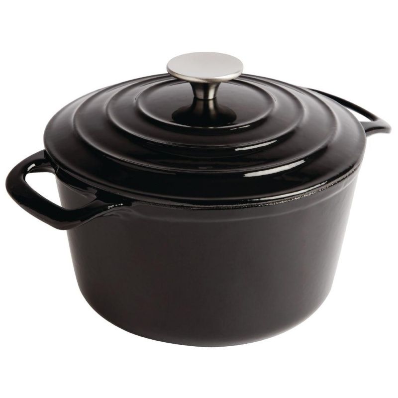 Cook delicious casseroles, stews, lasagnes and more with this traditional black, cast iron casserole dish from Vogue. The cast iron give the dish impressive heat retention and even heat distribution, whilst making it extremely strong and durable, perfect for any kitchen. A black, traditional design makes it perfect for use in any kitchen, and two large handles make it easy to move from oven to table.